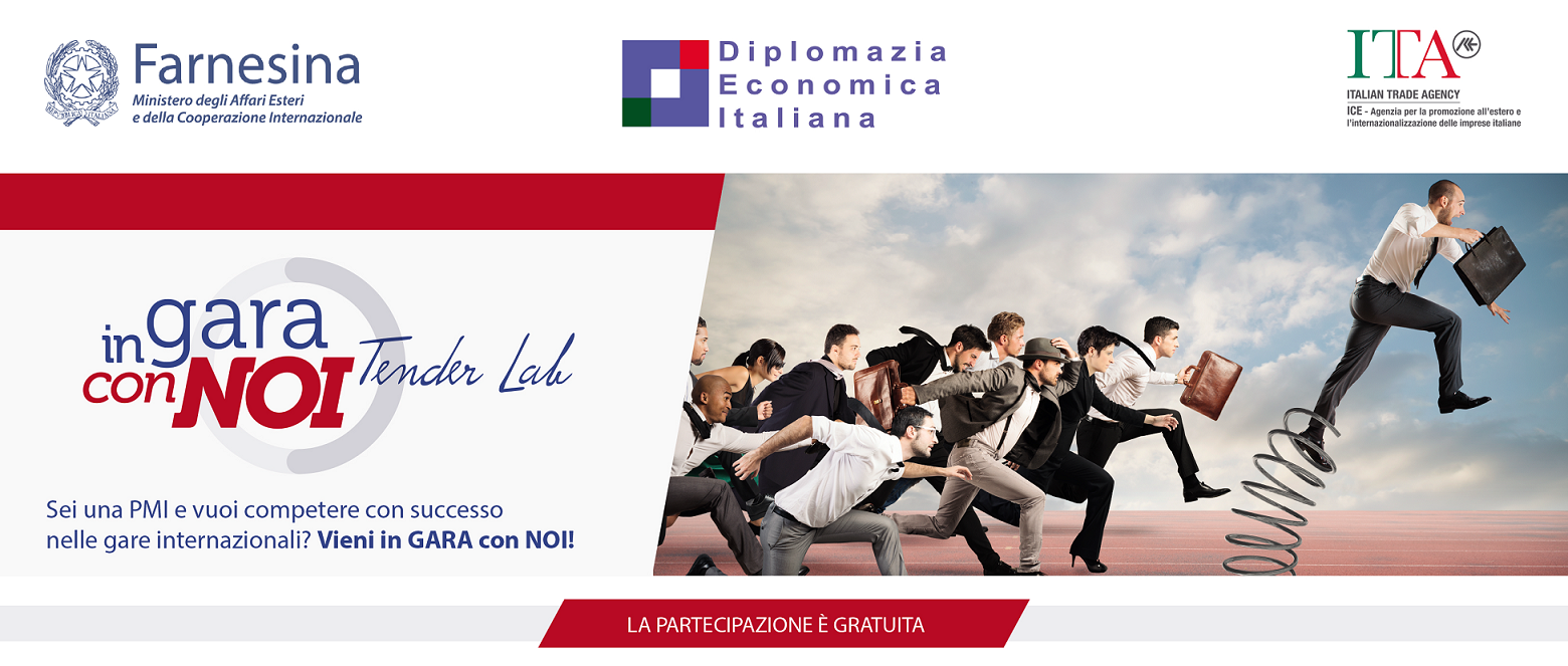 In Gara con Noi – Tender Lab è un progetto promosso dal Ministero degli Affari Esteri e della Cooperazione Internazionale, ideato e realizzato da ICE Agenzia in collaborazione con partner territoriali, per offrire un percorso di accompagnamento integrato alle PMI italiane e migliorare la loro capacità competitiva nelle gare internazionali (lavori / forniture / servizi).